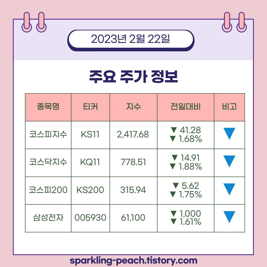 | 2023년 2월 23일 주요 주가 정보 (한국) (0) | 2023.02.23 |